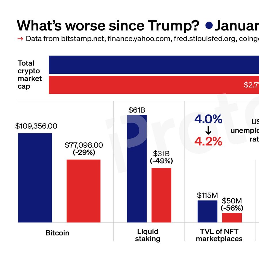 Since the Trump inauguration, crypto assets have shed a combined $800B from their market cap while BTC has lost nearly one-third of its value.