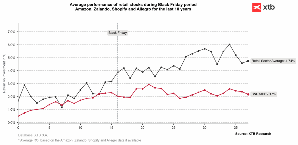 XTB research shows that e-commerce platforms tend to benefit the most during that period because they are directly impacted by the volume surge. While Amazon and Shopify are frequently listed as investment opportunities with high potential, XTB points out that their European counterparts, Zalando and Allegro, could be seen as the “dark horses” this season. Additionally, companies like Nike, Levi Strauss & Co., and L’Oreal S.A. could also stand to benefit from the shopping season if historical trends repeat.